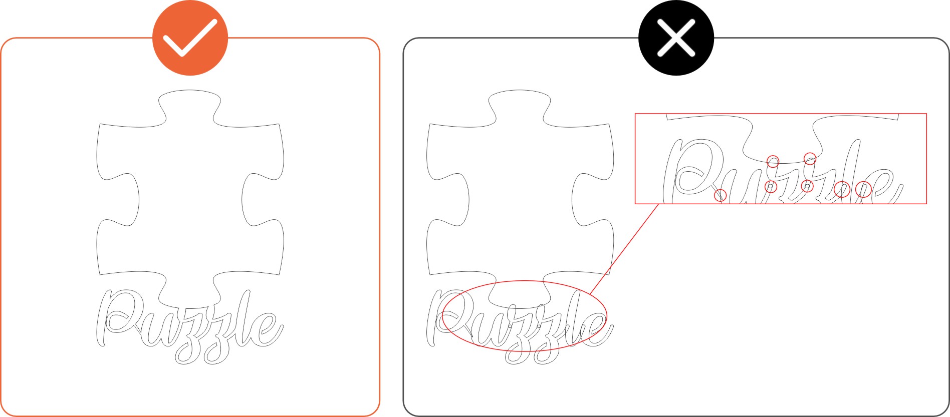 If your vector design contains any active text boxes, the CNC laser cutters won't process the cut correctly. To include text in your cut, convert active text boxes into shapes or outlines. This is a simple process in most design software.