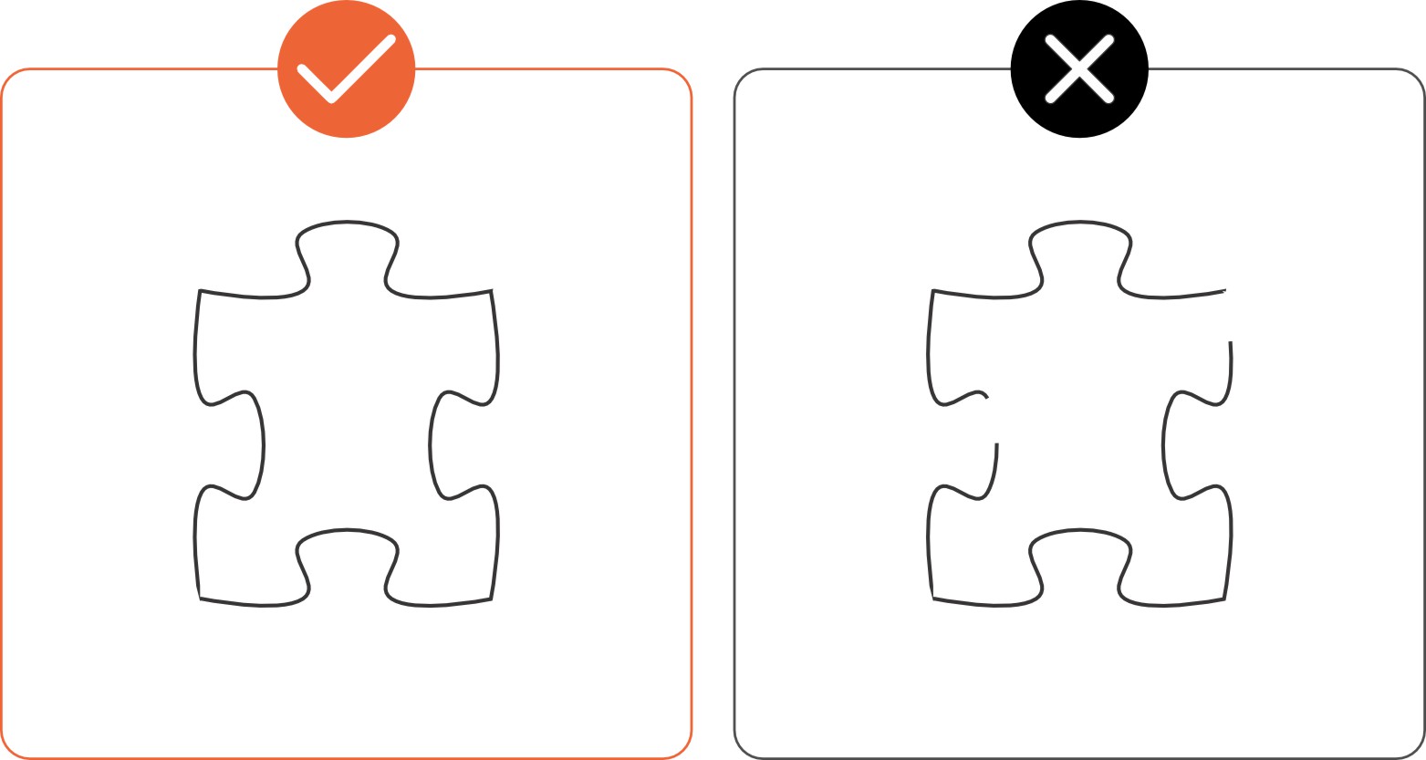 Ensure that no two parts in your design are touching or sharing a line. Make sure lines do not overlap or intersect. The laser will not interpret these correctly, resulting in parts not being cut. Viewing your design as a wireframe or in outline mode (Illustrator) can help you quickly spot these issues.